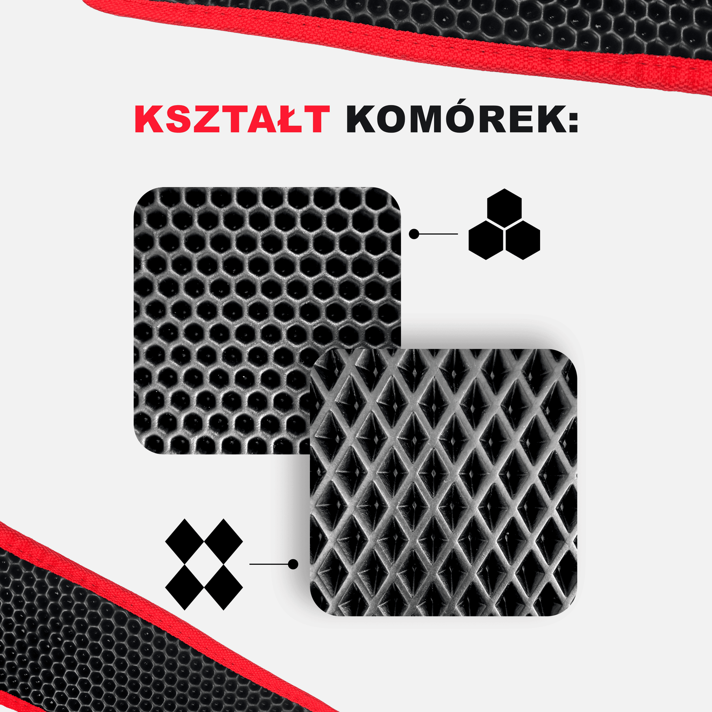 Dywaniki EVAMATS są dostępne w dwóch unikalnych strukturachplastry miodu lub romby.